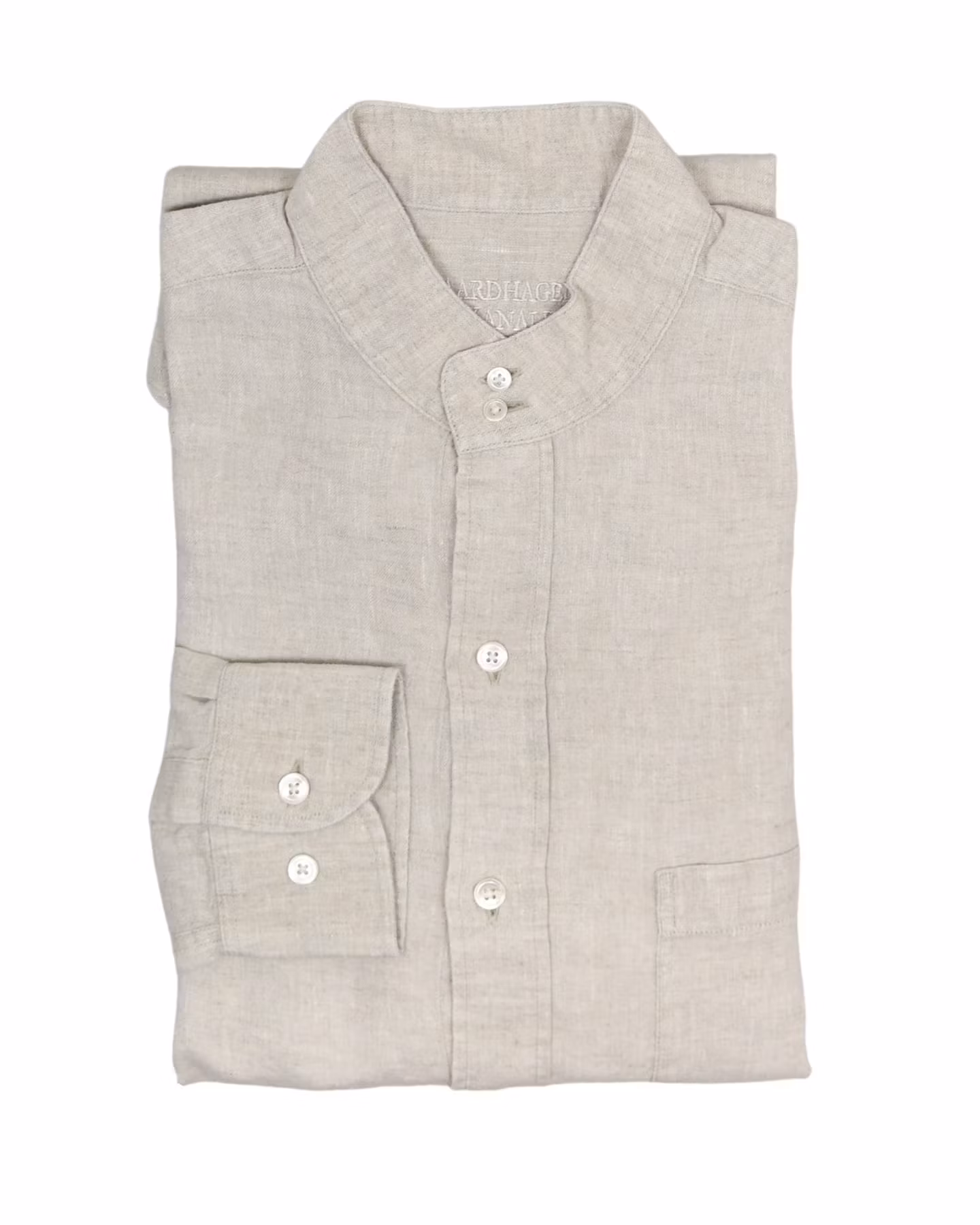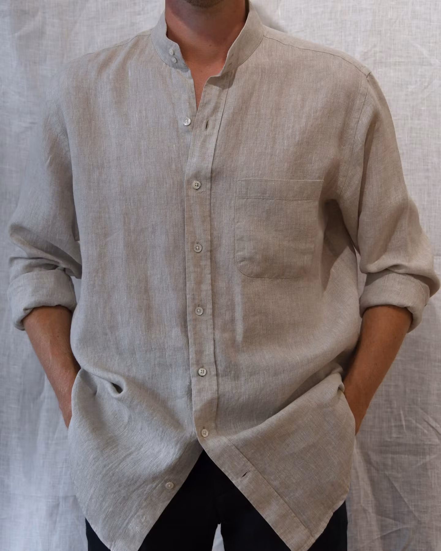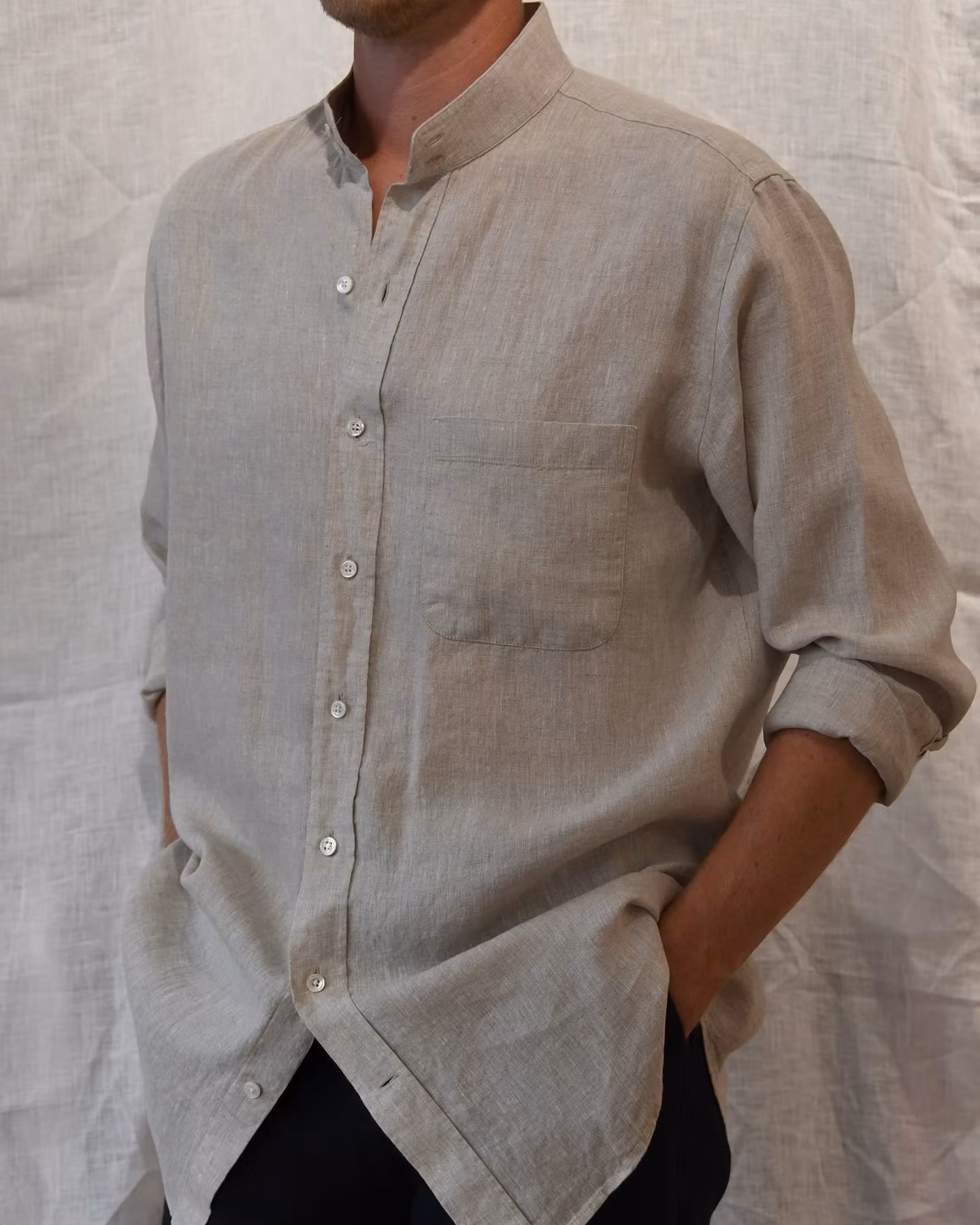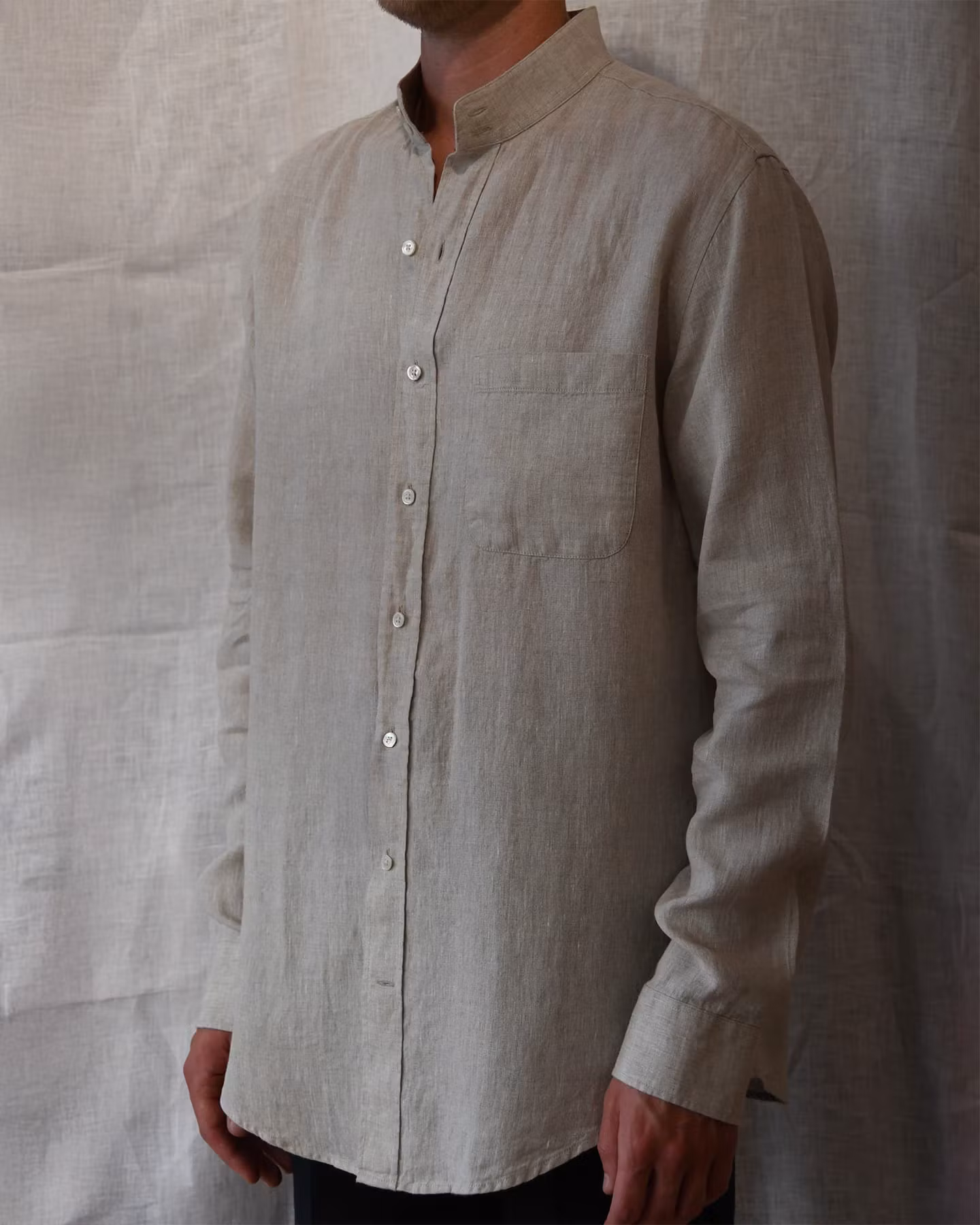 Med sina pärlemoknappar och bandkrage fungerar skjortan både till vardag och till fest, men med fokus på en mer avslappnad stil.