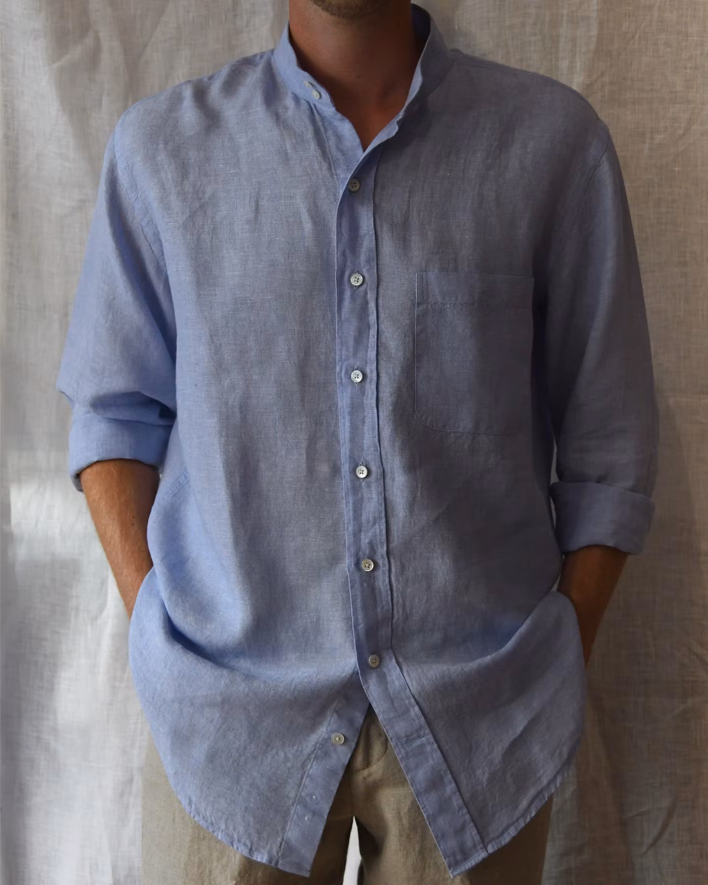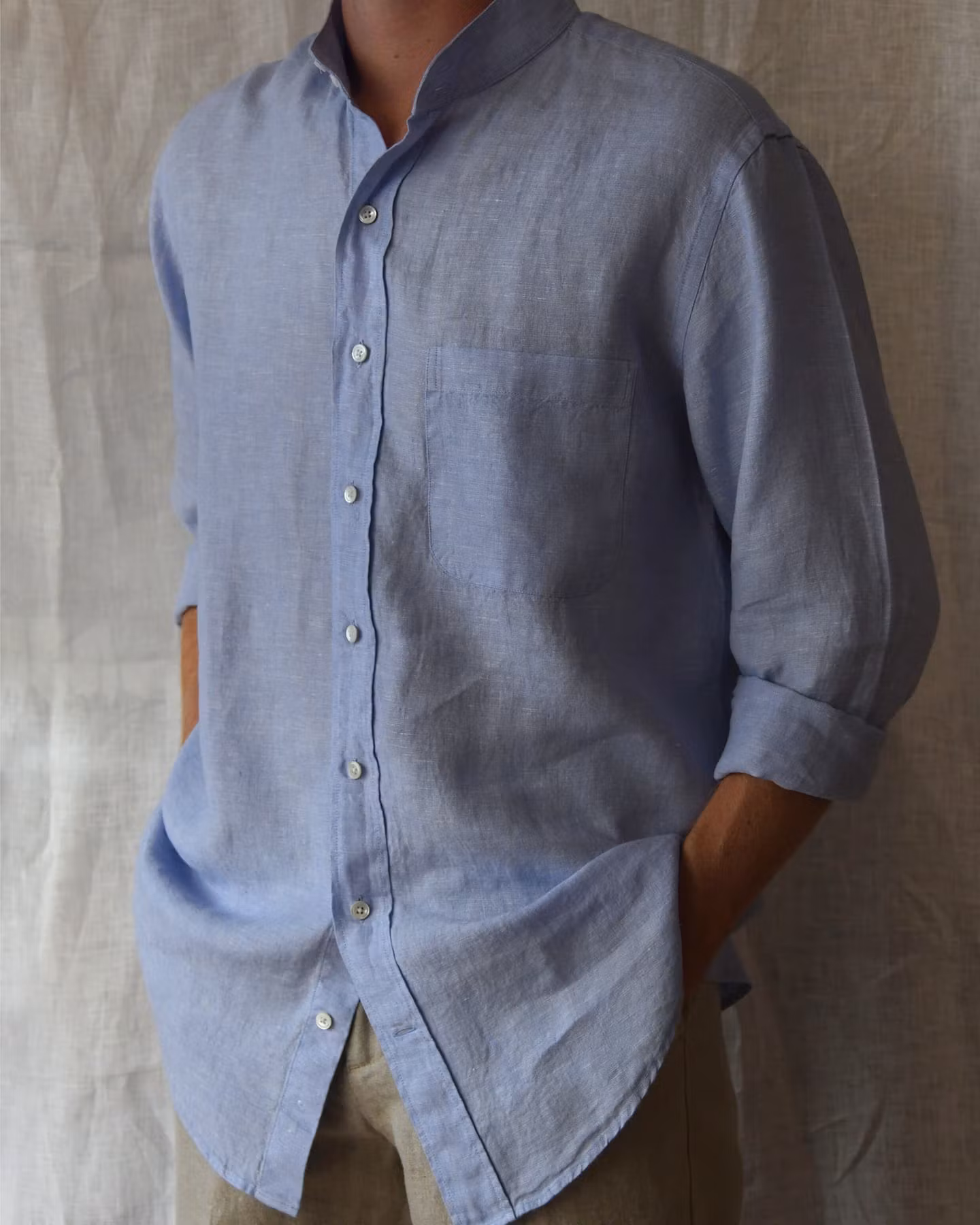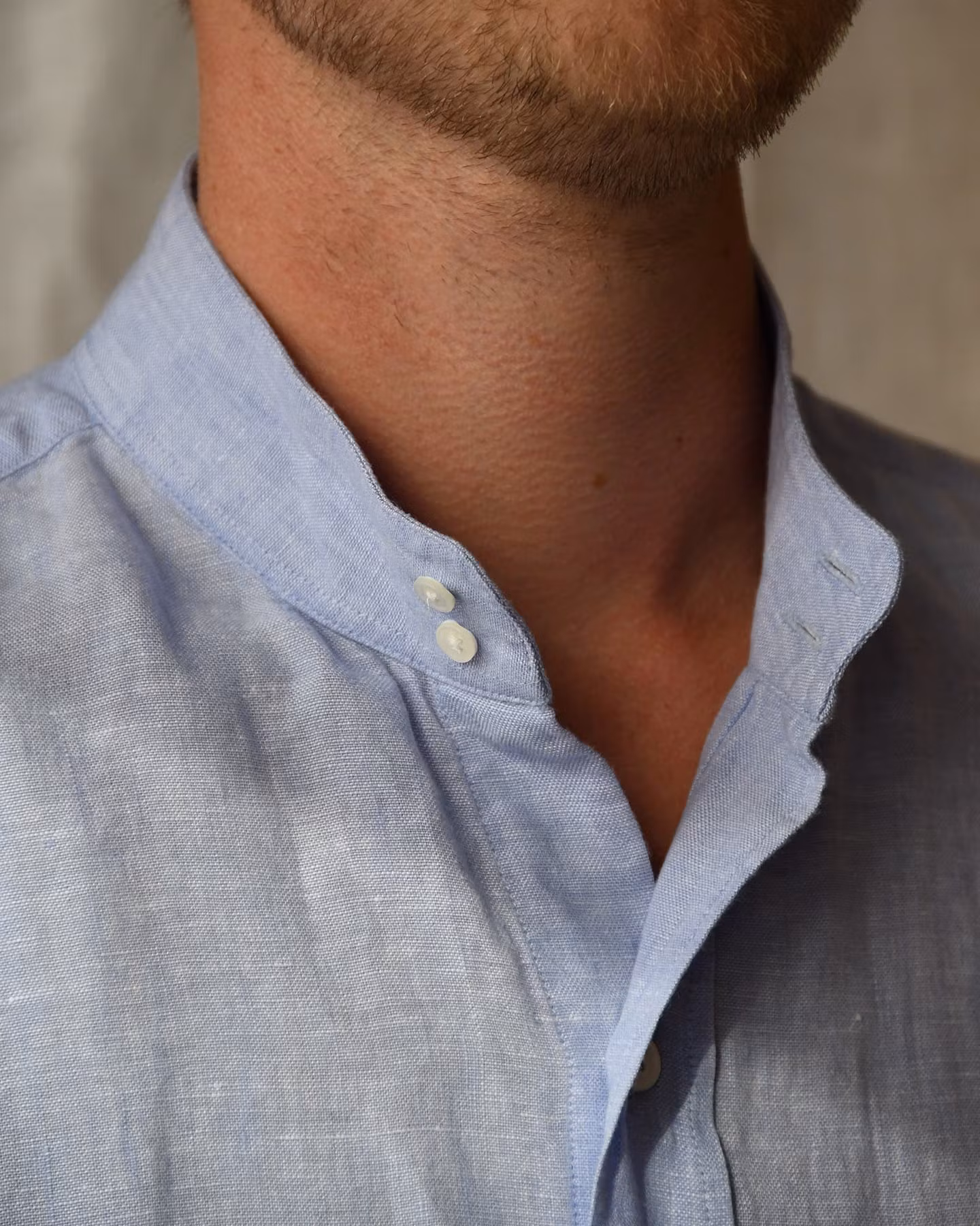 Med sina pärlemoknappar och bandkrage fungerar skjortan både till vardag och till fest, men med fokus på en mer avslappnad stil.