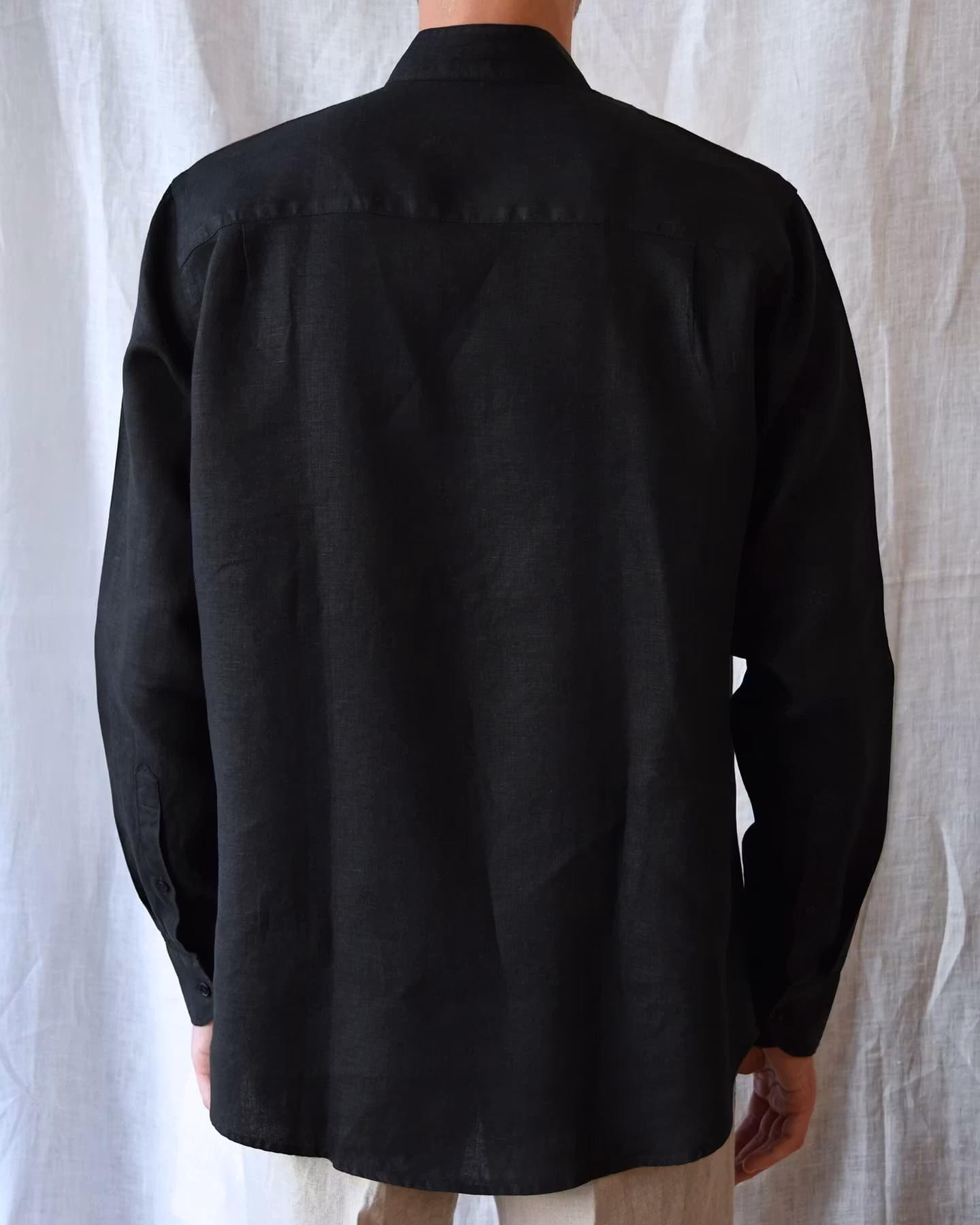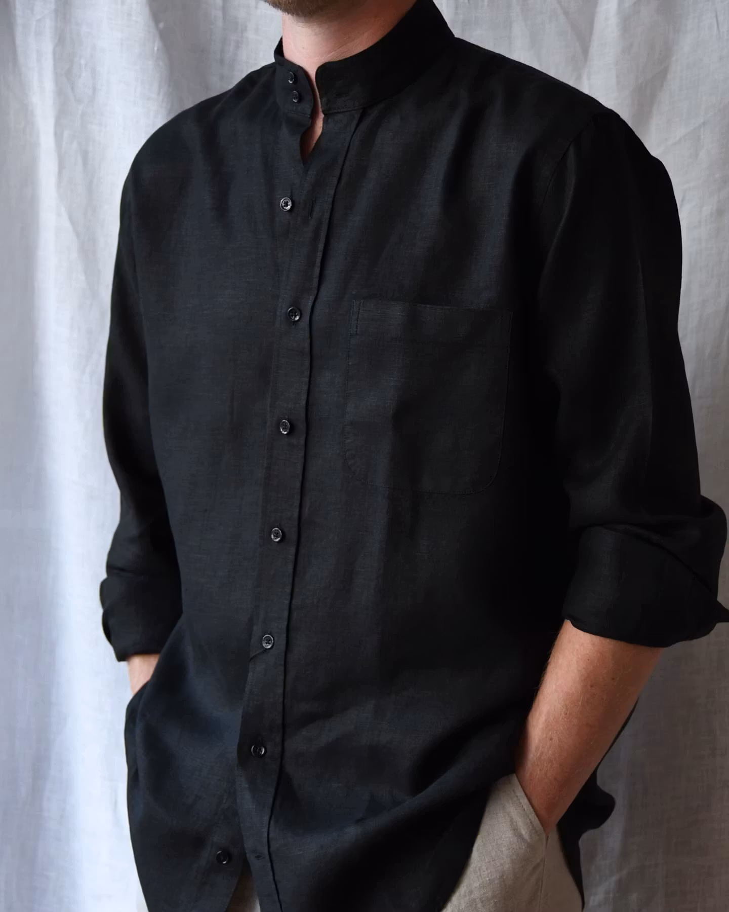 Med sina pärlemoknappar och bandkrage fungerar skjortan både till vardag och till fest, men med fokus på en mer avslappnad stil.