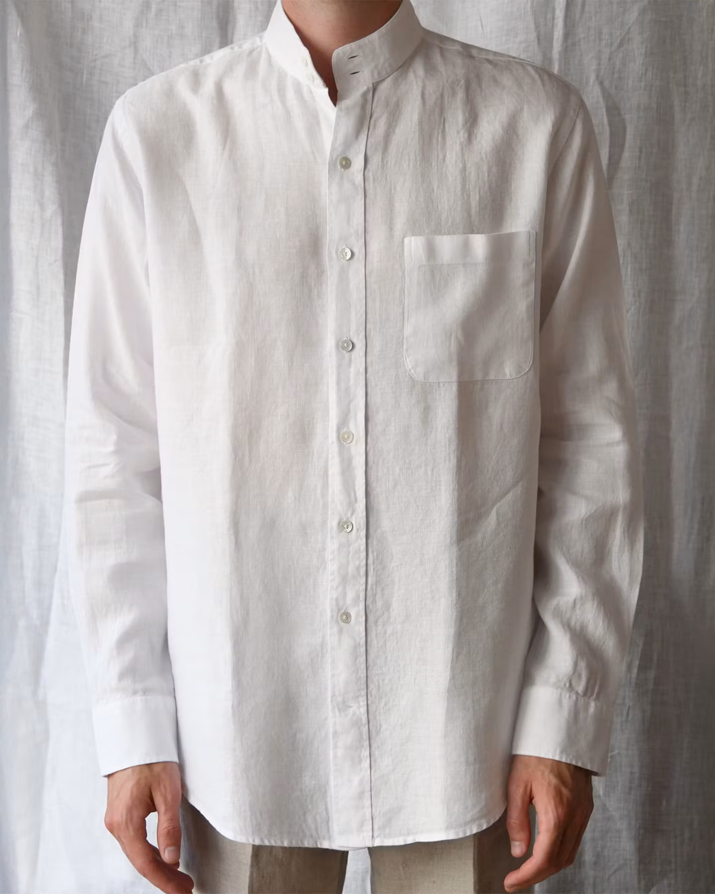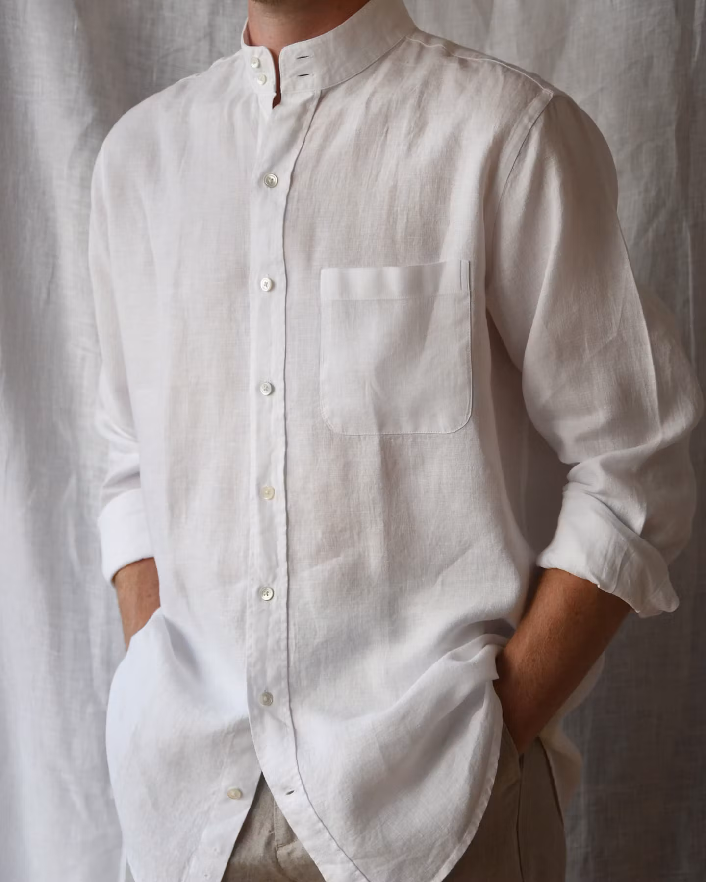 Med sina pärlemoknappar och bandkrage fungerar skjortan både till vardag och till fest, men med fokus på en mer avslappnad stil.